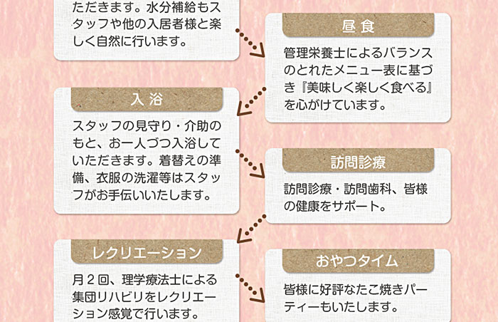 華の里では、「安全・安心」はもちろんのこと、ご利用者様により楽しく充実した時間をお過ごしいただくために、さまざまなサービスをご用意しております。